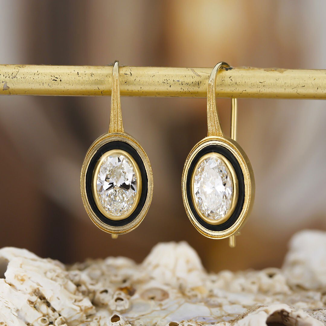 Paramount Drop Earrings with Oval White Diamonds in in Black Chrome and 18kt Yellow Gold by Sarah Graham. Picture frame style drop earrings in 18kt yellow gold with oxidized cobalt chrome accents surrounding oval white diamonds. Diamond details to be determined.