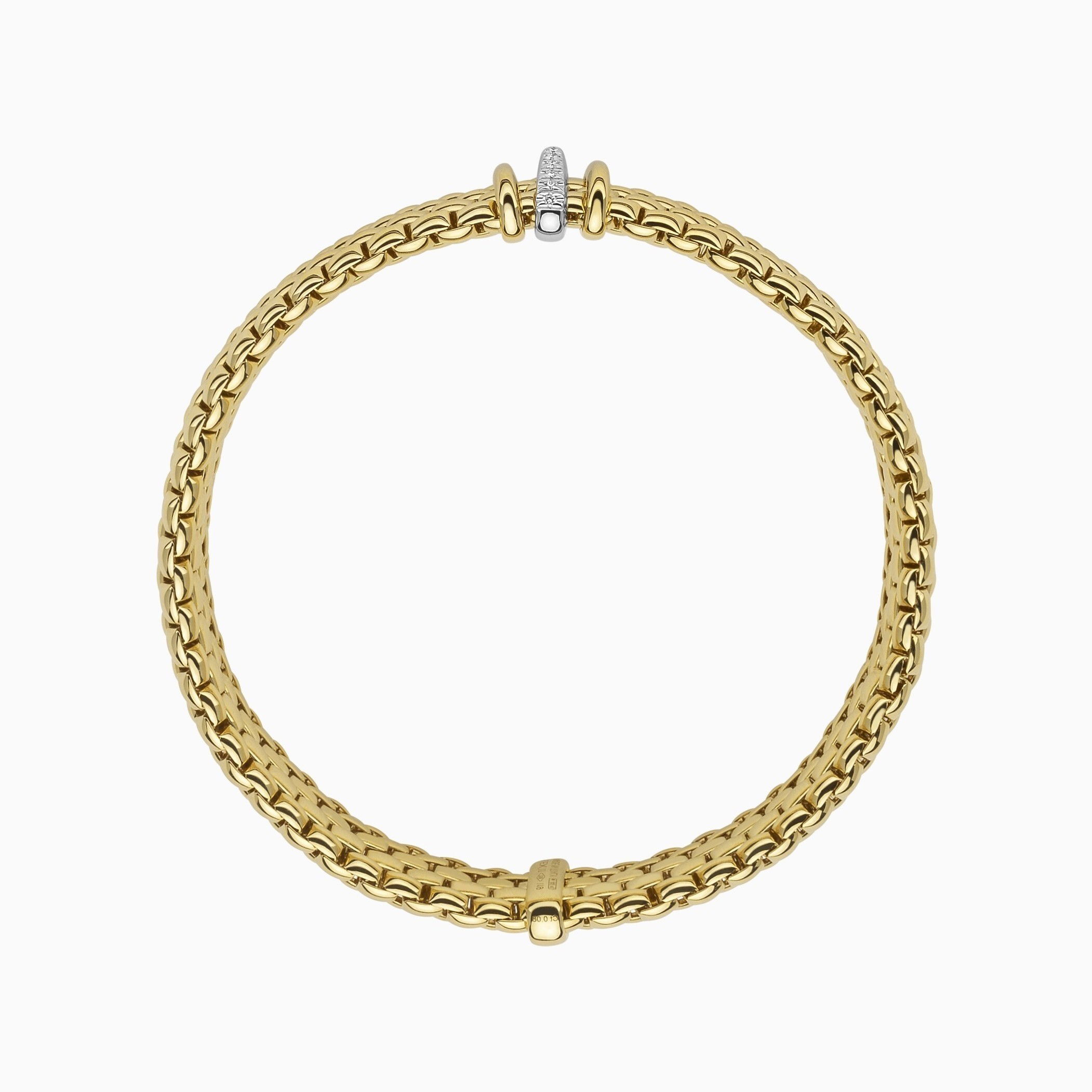 Panorama Flex'It Bracelet in 18kt Yellow Gold with two plain yellow gold and one White Gold and White Pave Diamond Elements at 0.08ctw - The bracelet measures 9mm wide by 3.5mm deep and is a size large, 18cm or 7.08 inches internal circumference.