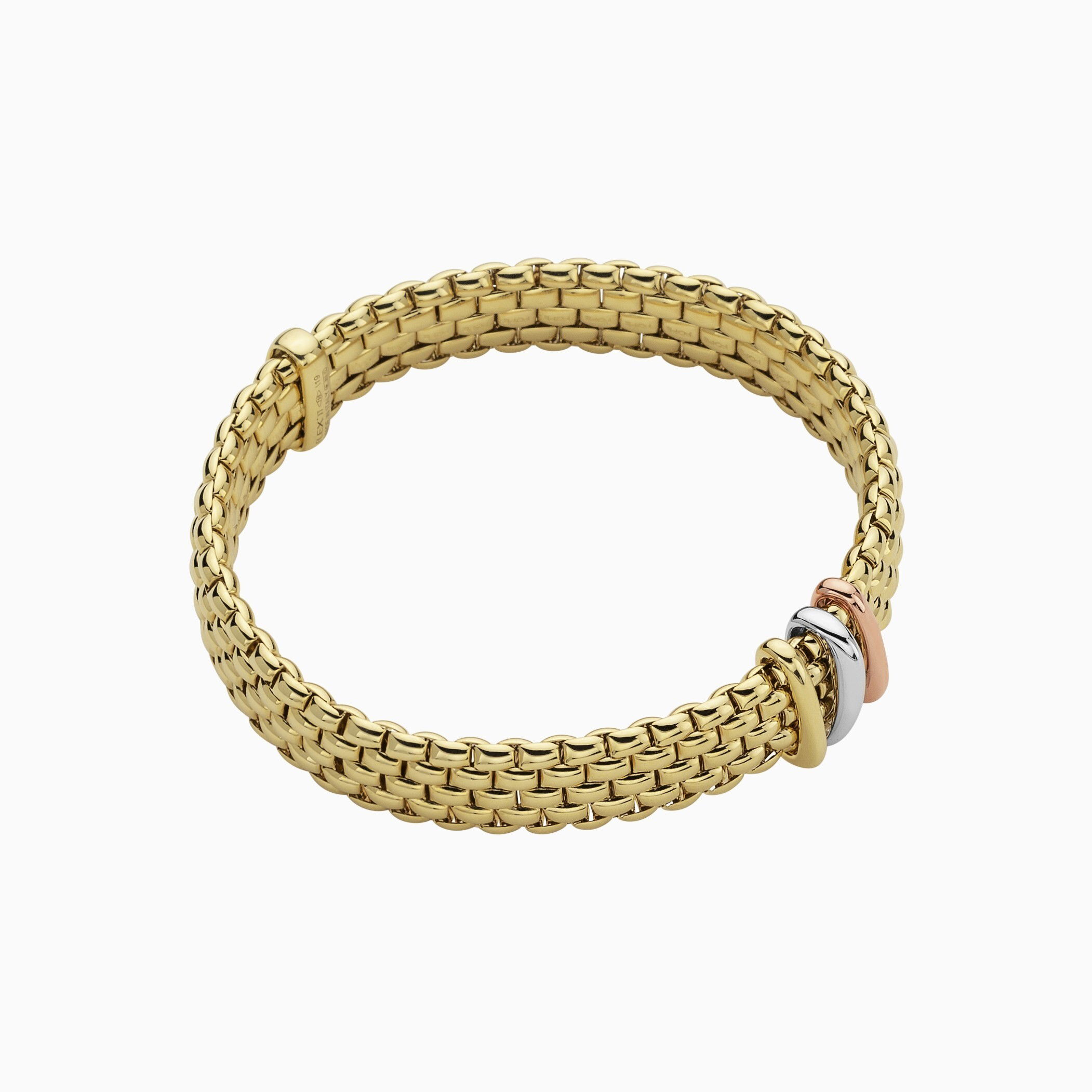 Panorama Flex'It Bracelet in 18kt Yellow Gold with three plain yellow gold, white gold and rose gold elements - The bracelet measures 9mm wide by 3.5mm deep and is a size extra small, 15cm or 5.90 inches internal circumference. 587BXS-Y