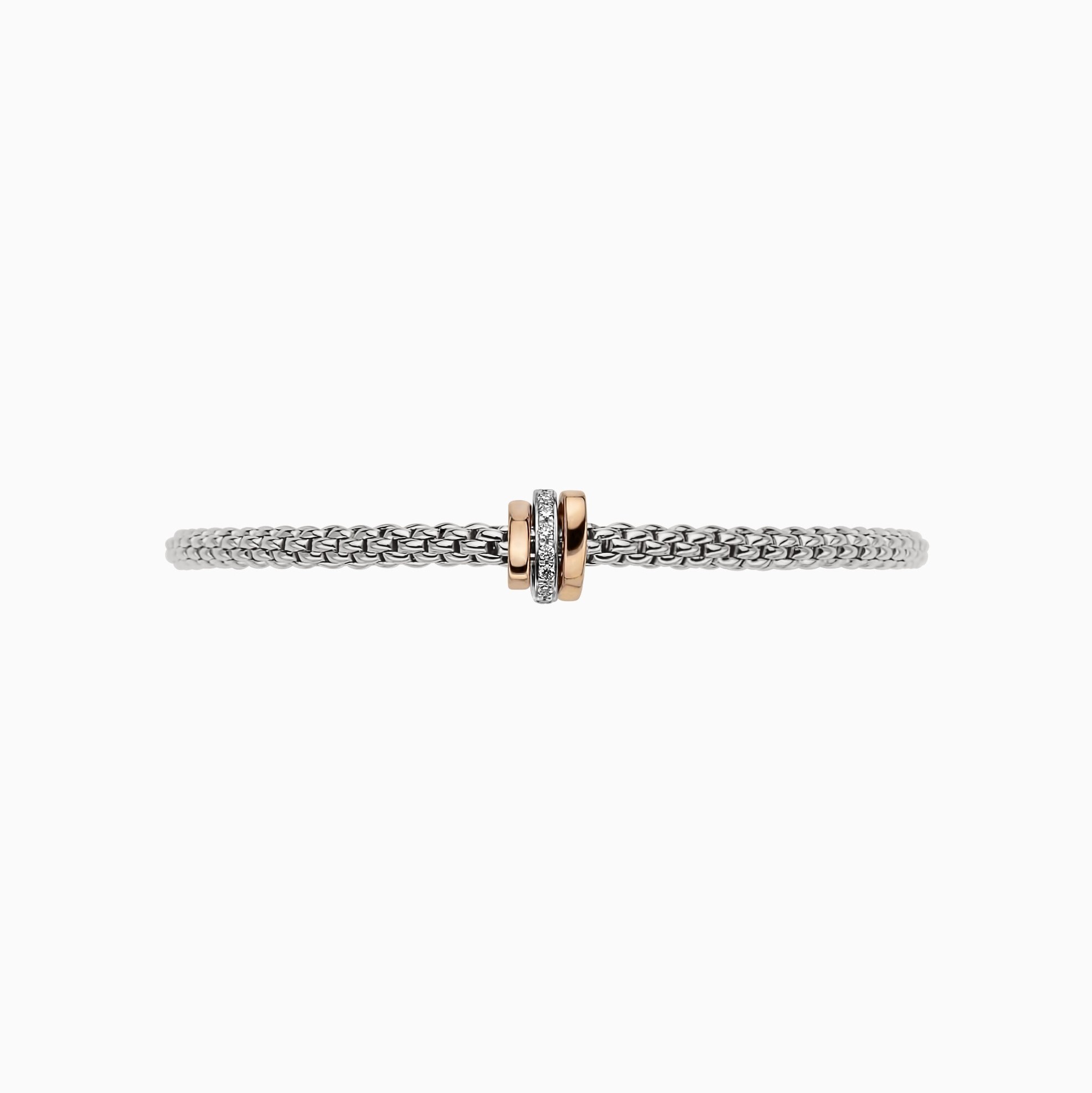Prima Flex'It Bracelet in 18kt White Gold with two plain rose gold and one White Gold and White Pave Diamond Elements at 0.10ctw - The bracelet measures 3.4mm in diameter and is a size extra large, 19cm or 7.48 inches internal circumference.