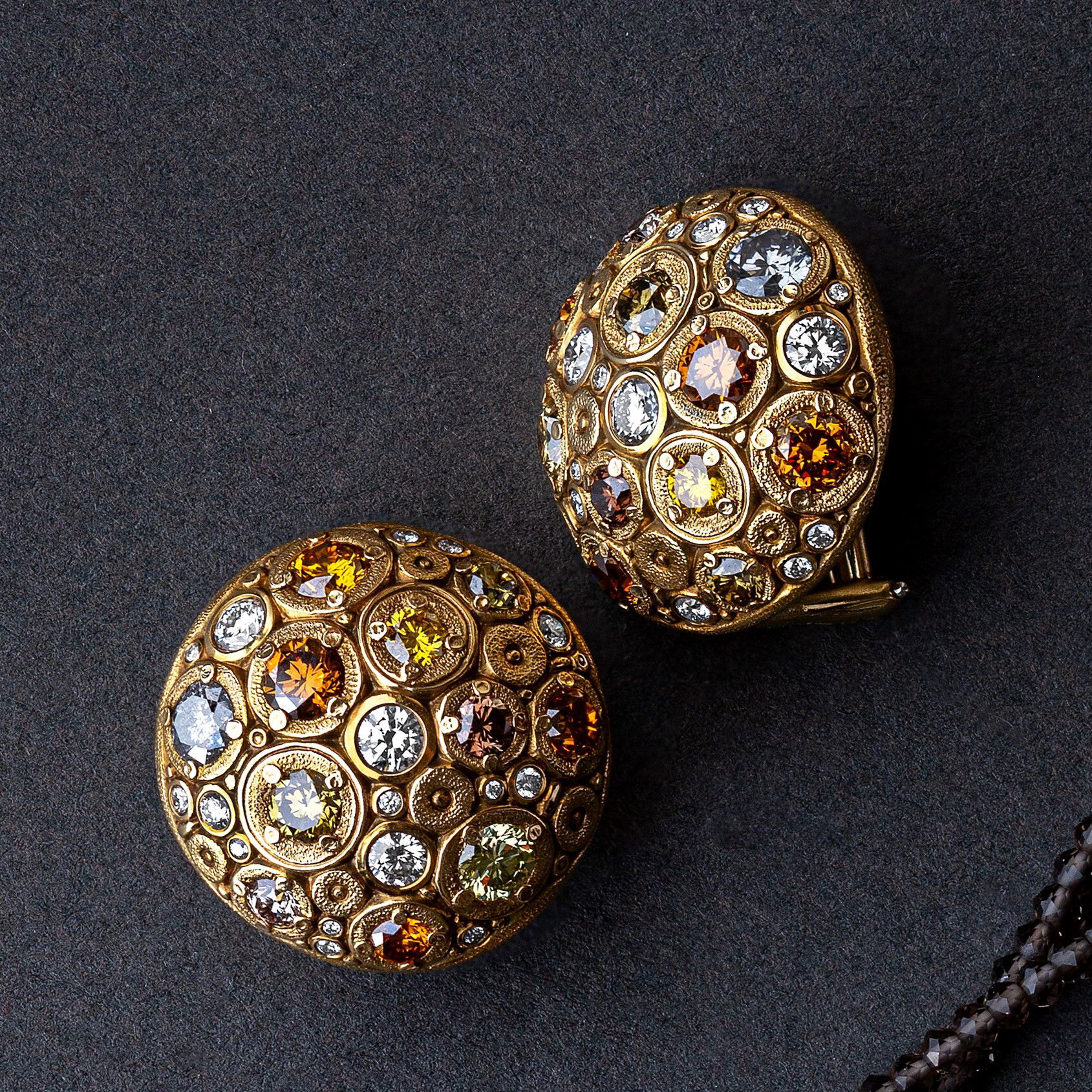 Blooming Hill Button Earrings with Natural Color Diamonds in 18kt Yellow Gold by Alex Sepkus - Twenty two natural color diamonds at 3.35ctw flush set with thirty four white diamonds at 1.01ctw in 18kt hand engraved 18kt yellow gold. The earrings are 21mm in diameter with a domed profile and post with omega backs.