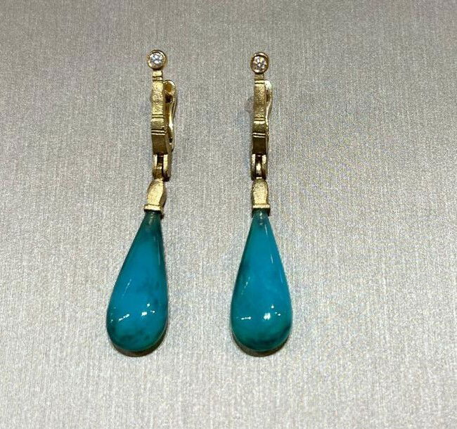 Sticks and Stones 10.58ctw Blue Opal Drop Earrings in 18kt Yellow Gold by Alex Sepkus.? Sticks and Stones earring tops in 18kt yellow gold with two white diamonds at 0.11ctw with top drilled blue opal teardrop shape stones at 10.58ctw.? One of a Kind Sticks and Stones design.