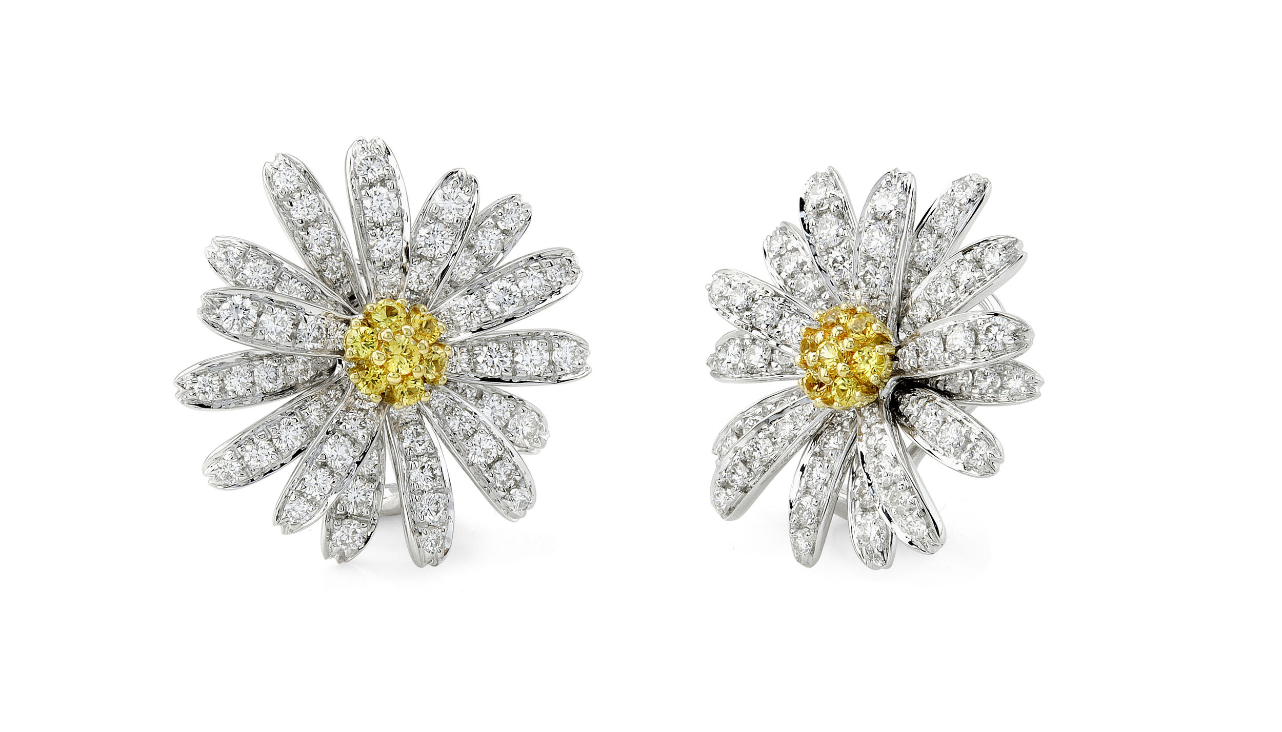 - Diamond Pave Daisy Earrings with Yellow Sapphire Centers in 18kt White Gold