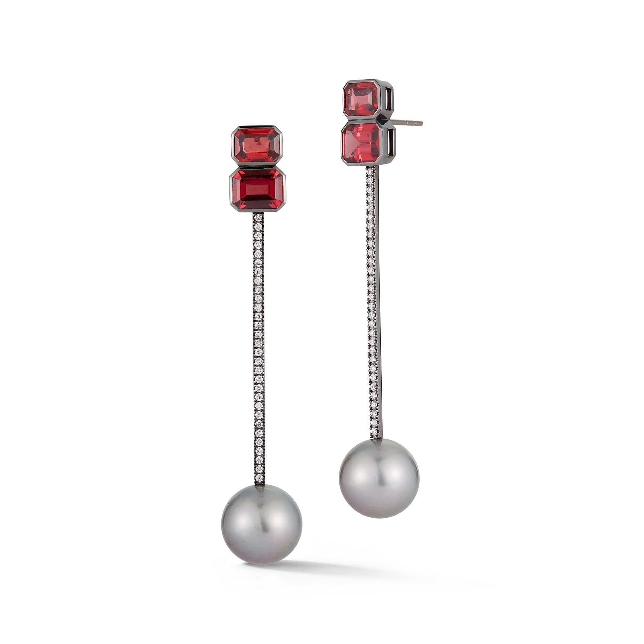 Tik Tok Earrings with Rhodolite Garnet and Grey Tahitian Pearls in 18kt White Gold by Katherine Jetter. Four emerald cut rhodolite garnets anchor the top of the earring while a delicate bar covered in white diamond pave is set at the bottom with grey Tahitian pearls. All set in 18kt white gold with black rhodium over.