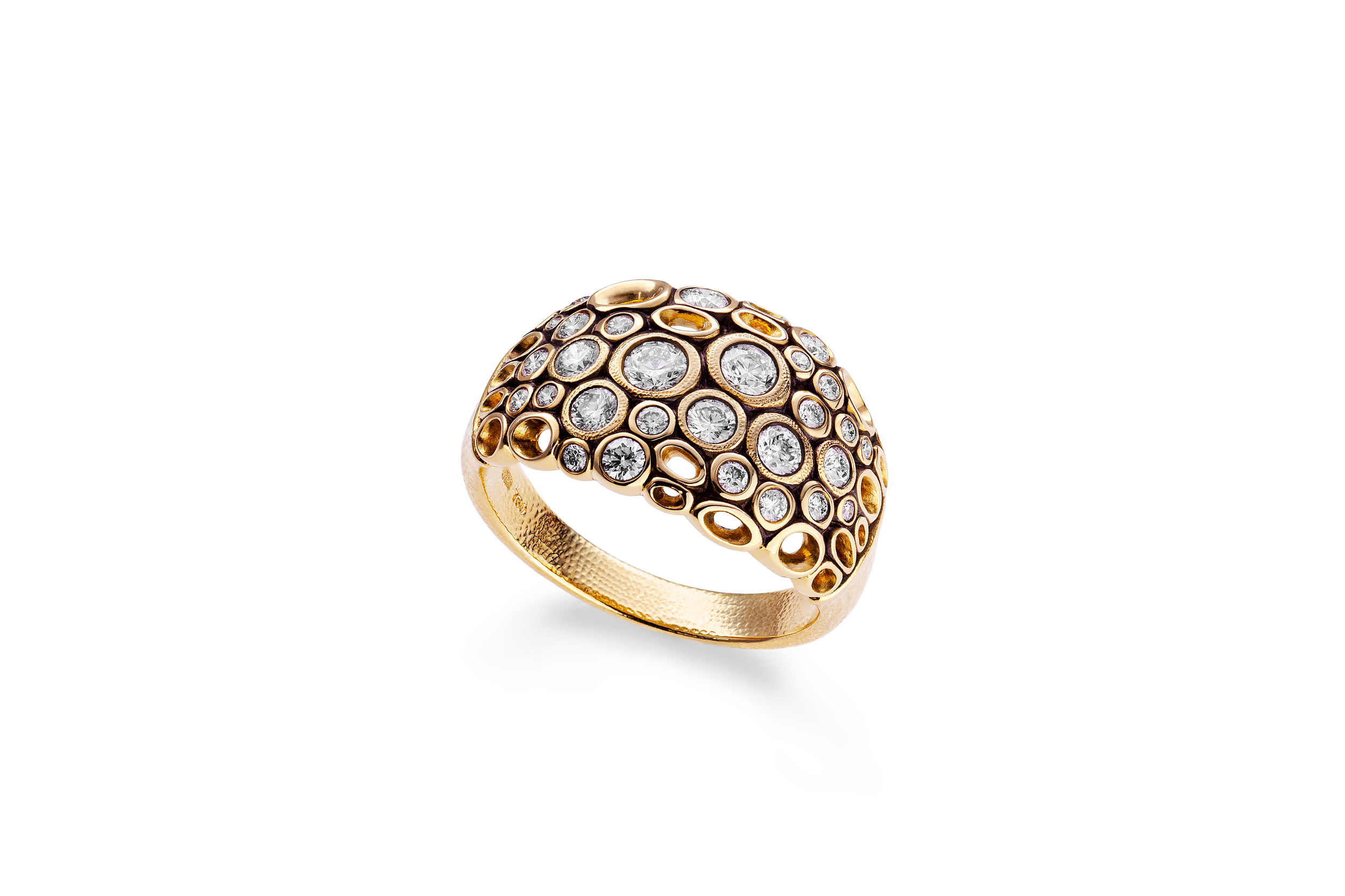 Open Work Wide Dome Ring with White Diamonds in 18kt Yellow Gold by Alex Sepkus - Twenty eight white diamonds at 0.77ctw bezel set and designed between open circles and ovals in 18kt yellow gold.