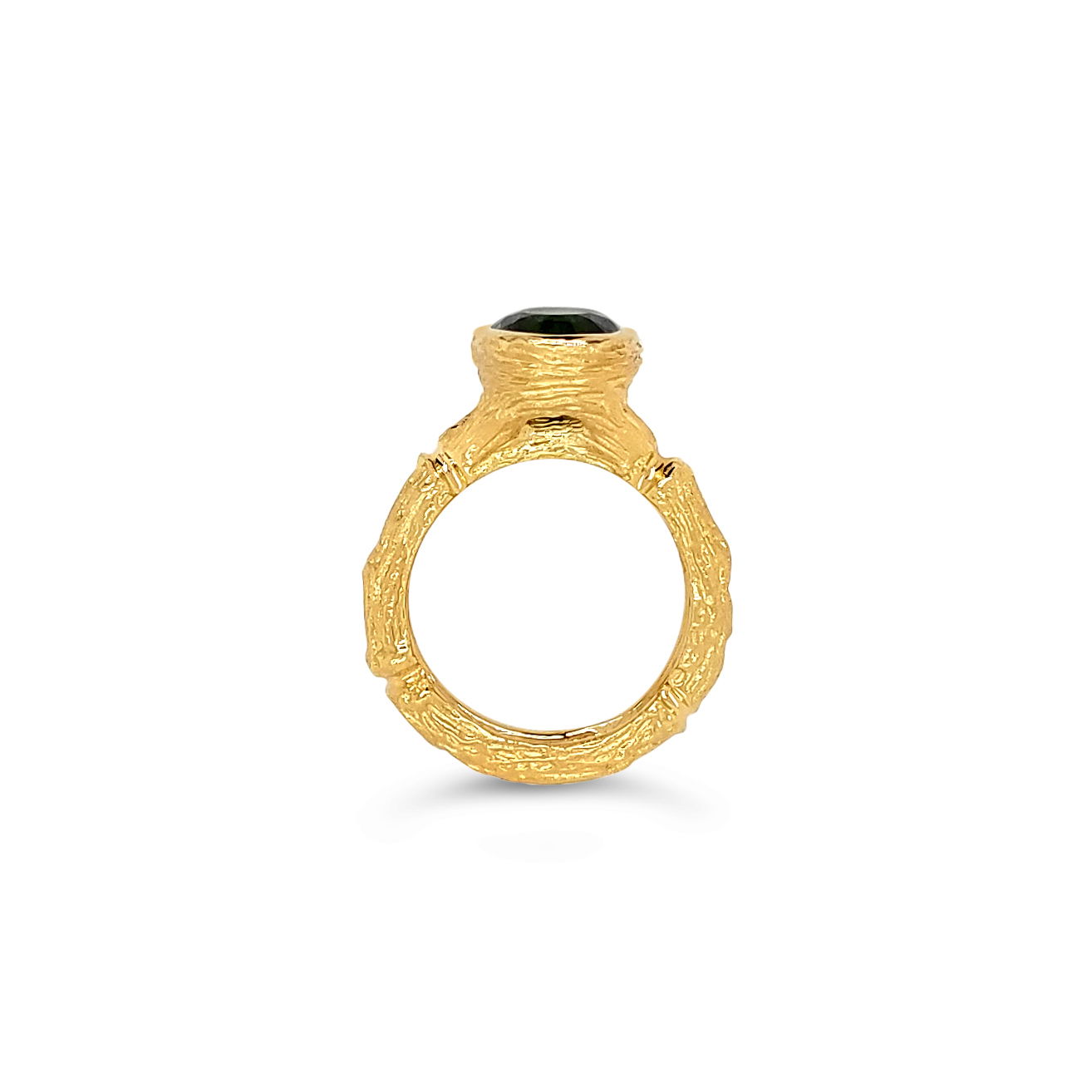 Oval Green Tourmaline Branch Ring with Diamonds in 19kt Yellow Gold by Aaron Henry Designs. One oval green tourmaline at 3.39ct set at the center and accented with 0.20ctw of white diamonds. The ring is cast with Aaron's proprietary Inches Branch Inches texture in rich 19kt yellow gold.