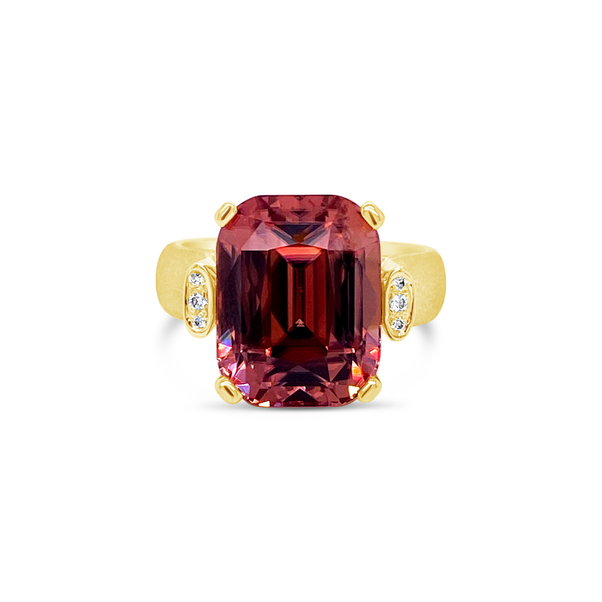 - Cushion Cut Cinnamon Zircon Ring with Diamonds and Aspen Finish in 18kt Yellow Gold