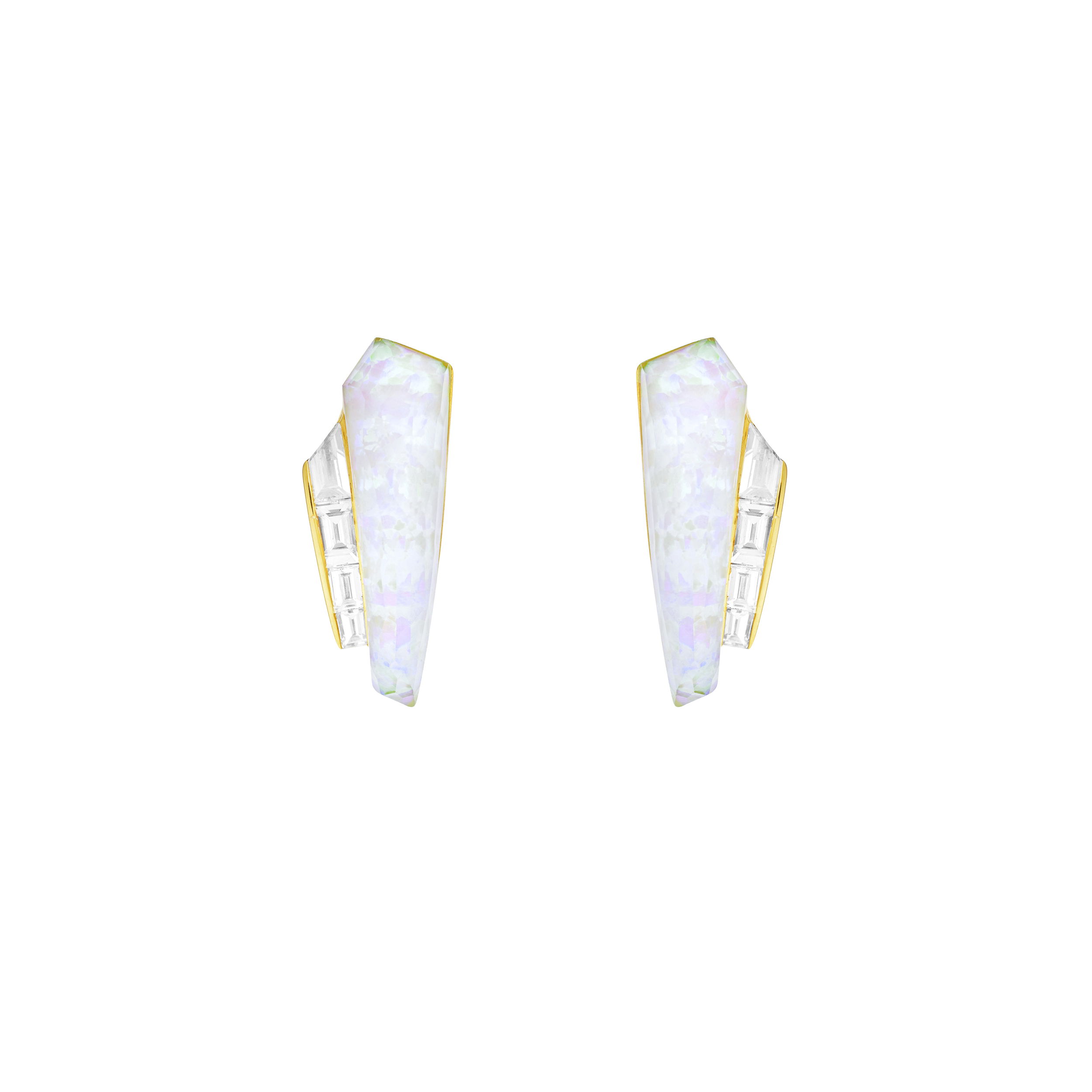 CH2 Shard Slimline Cuff Earrings with White Opalescent in 18kt Yellow Gold by Stephen Webster. Crystal Haze Slimline Cuff Earrings - 18kt yellow gold set with white opalescent under clear quartz Crystal Haze at 5.07ct and baguette white diamonds 0.42ctw.